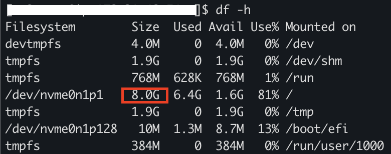 - 원인: EBS는 늘렸지만, OS 파티션/파일시스템은 8GB 상태
